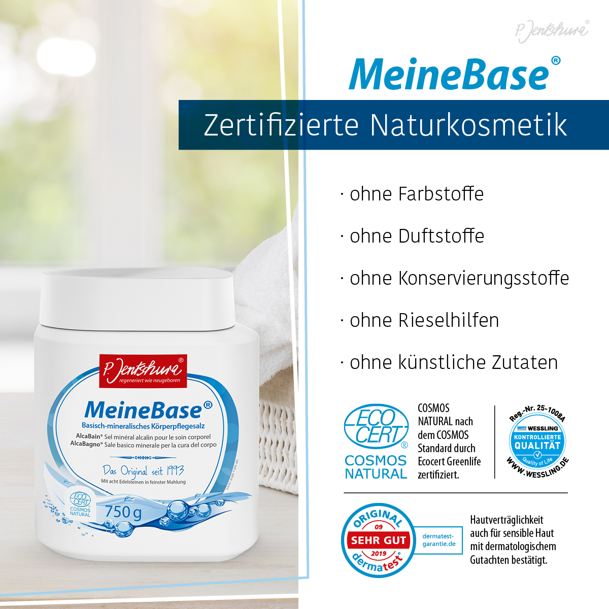 Tauchen Sie mit MeineBase in die faszinierende Welt der basischen Körperpflege ein. Das basisch-mineralische Körperpflegesalz reinigt, pflegt und entspannt besonders intensiv. Das zertifizierte Naturkosmetikprodukt optimiert die Selbstfettung der Haut und schenkt ihr eine angenehme Geschmeidigkeit – ideal bei trockener, juckender und empfindlicher Haut sowie bei Hautproblemen wie Neurodermitis, Schuppenflechte oder Ekzemen. Mit einem pH-Wert von 8,5 unterstützt MeineBase die Haut in ihrer Ausscheidungsfunktion und entlastet dadurch den Stoffwechsel – für eine bewusste und natürliche Pflege in der Säure-Basen-Balance.